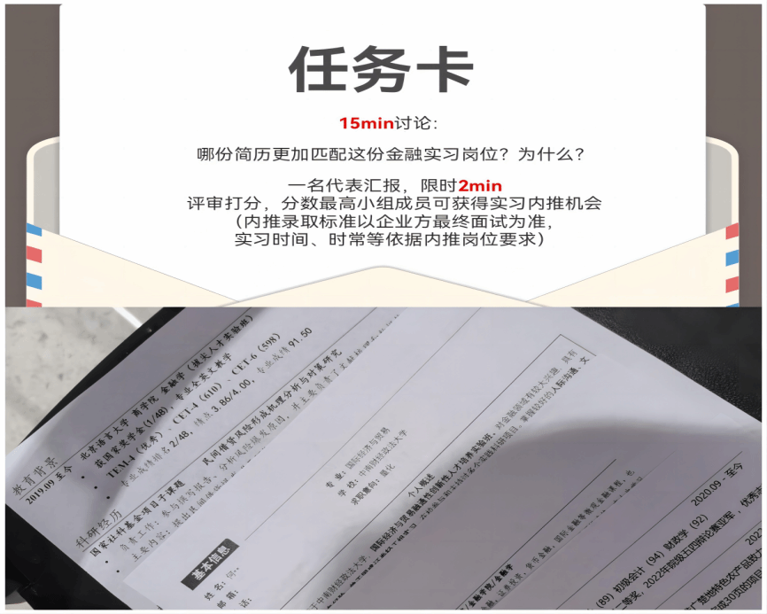 在简历工作坊小游戏环节,学生们自由组队分成6个小组,小组成员共同探讨每份简历的优势,挖掘亮点,去匹配模拟职位的契合度,并派出小组代表进行总结发言,由高顿项目部杨思婧老师进行点评。